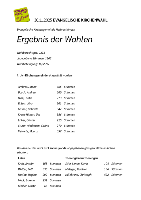 Bei der Kirchenwahl am 1. Dezember 2019 wurde für eine Amtszeit von 6 Jahren der Kirchengemeinderat gewählt.