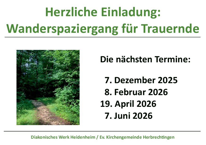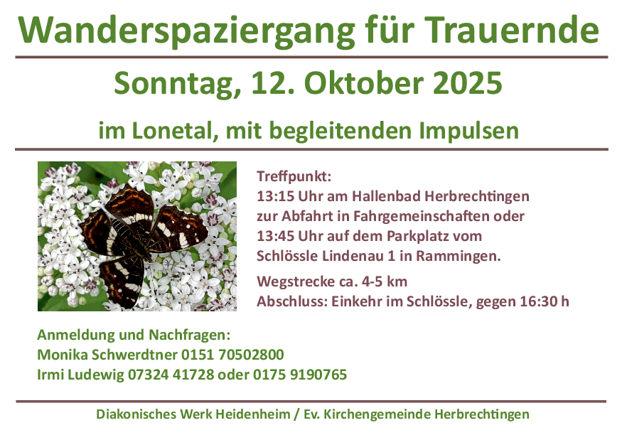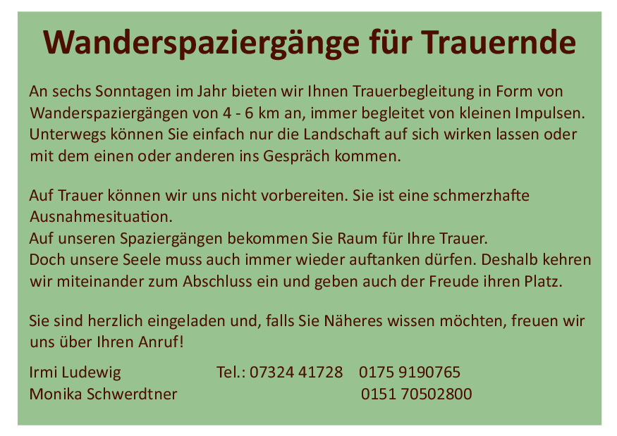 Leider ist es uns momentan nicht möglich, Nachmittage für Trauernde zu gestalten. Gerne können wir aber am Telefon oder auf einem Spaziergang miteinander reden.